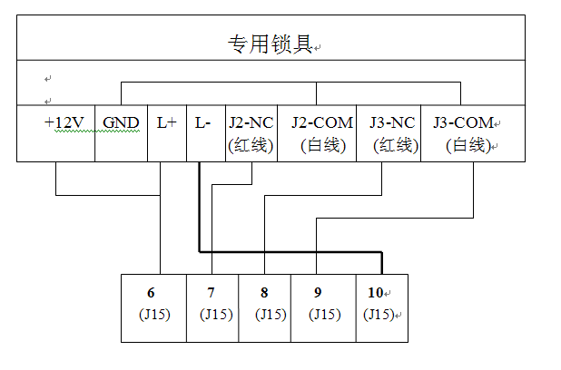 +12V GND L+ L- 位于專用鎖具主板上的端子,J2-NC、J2-COM、J3-NC、J3-COM位于專用鎖具狀態(tài)板上J2和J3。