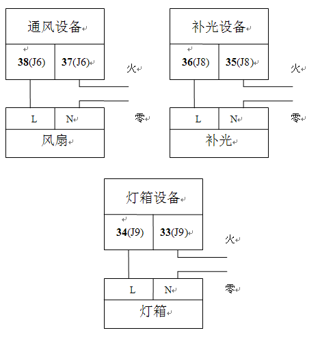 控制器通過繼電器來控制燈箱等強電設(shè)備,請按照上圖中接線圖來連接繼電器和受控設(shè)備,繼電器連接圖如圖7。