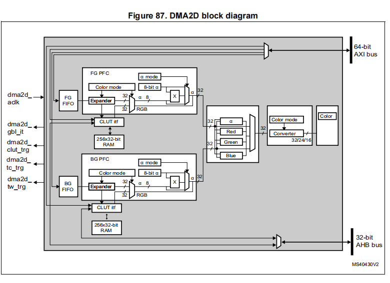 DMA2D 是與 LTDC 配套的硬件加速引擎,支持圖形繪制的并行處理,可獨(dú)立完成區(qū)域填充、圖像拷貝、格式轉(zhuǎn)換、alpha 混合等操作,減少 CPU 參與,提升渲染效率,響應(yīng)時(shí)間在微秒級(jí),適合實(shí)時(shí)圖形更新。