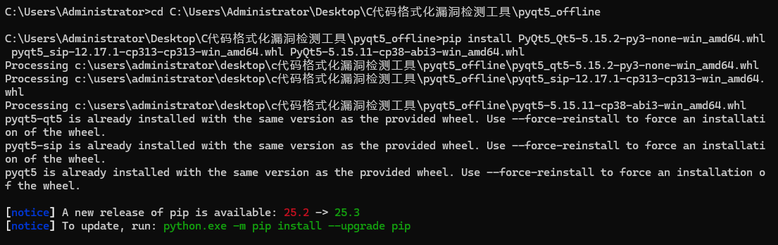 cd C:\Users\Administrator\Desktop\C代碼格式化漏洞檢測(cè)工具\pyqt5_offline (按照自己的路徑 。CD不過(guò)去,拷貝到C盤(pán)或者桌面右鍵終端打開(kāi)重試)