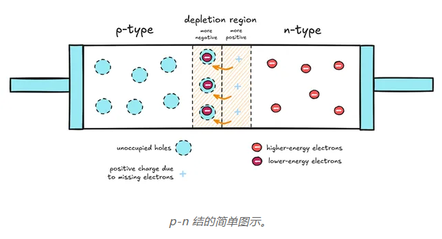 當 n 型材料與 p 型半導體接觸時,來自 n 側的高能電子會隨機擴散到 p 側,然后迅速落入大量的低能空穴中。這會在結處產生一個內部電場,達到熱力學平衡。n 側帶正電荷,p 側帶負電荷: