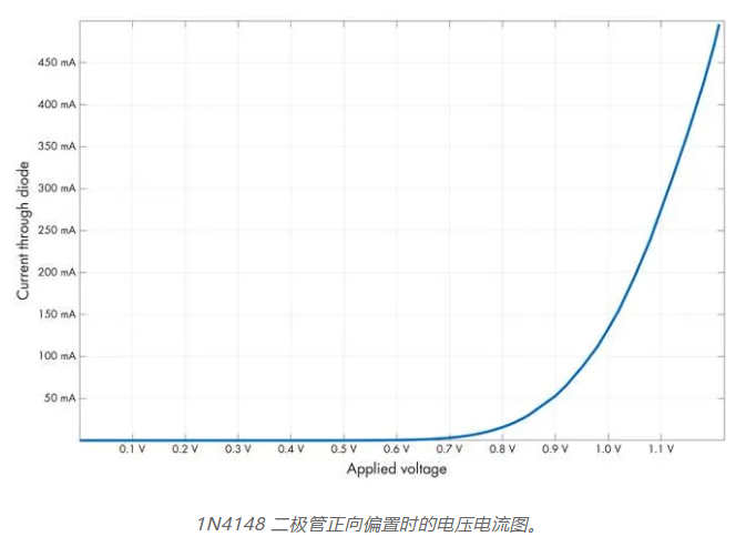 傳統(tǒng)的二極管就是一個 p-n 結。該元件可以被認為是一個基本的電壓控制器件:當電壓低于某個閾值時,它表現(xiàn)出非常高的電阻:通常超過 100 kΩ,因此幾乎沒有電流可以通過。當超過該閾值時,二極管開始允許更可觀的電流通過。V-I 曲線最初是指數(shù)型的,但很快,材料的固有電阻開始占主導地位。從那時起,電流與“多余的”施加電壓大致呈線性關系: