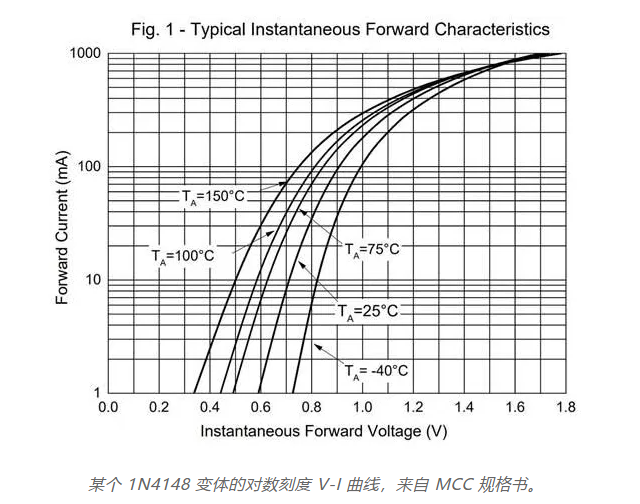 糾結于真實二極管的精確數(shù)學模型沒有太大意義,但我關于 V-I 曲線并非真正指數(shù)型的斷言可能與你在別處聽到的相悖。為了支持這一點,我們可以在對數(shù)尺度上觀察其行為。在這個視圖中,指數(shù)增長應該呈現(xiàn)為一條直線;然而,二極管的曲線卻明顯彎曲: