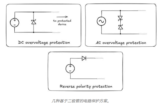 最下方的圖顯示了另一種保護技術。一個具有高反向擊穿電壓的普通正向偏置二極管與電源串聯(lián);這種布置可以防止在電源極性意外接反(例如電池裝反)時損壞敏感元件。其代價是 p-n 結上不可避免的電壓降,以及如果電流很高時的阻性發(fā)熱,因此通常首選基于晶體管的解決方案,尤其是在低壓電路中。