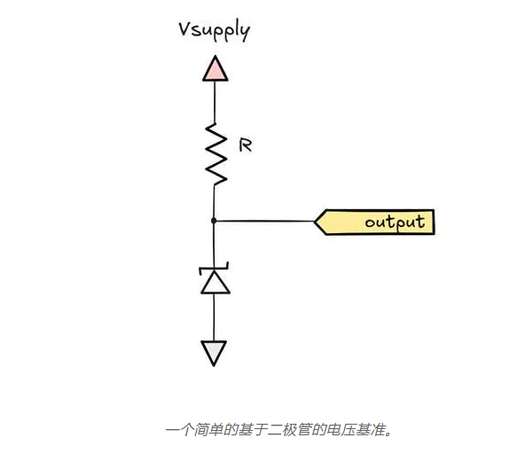 這一觀察結果使得二極管可用作電壓基準。我們使用一個未穩(wěn)壓的電源,例如電池,在最簡單的變體中,使用一個電阻來大致限制流過二極管的電流。根據(jù)你想要的電壓,你可以使用一個或多個正向偏置的二極管、一個反向偏置的齊納二極管,或它們的某種組合。