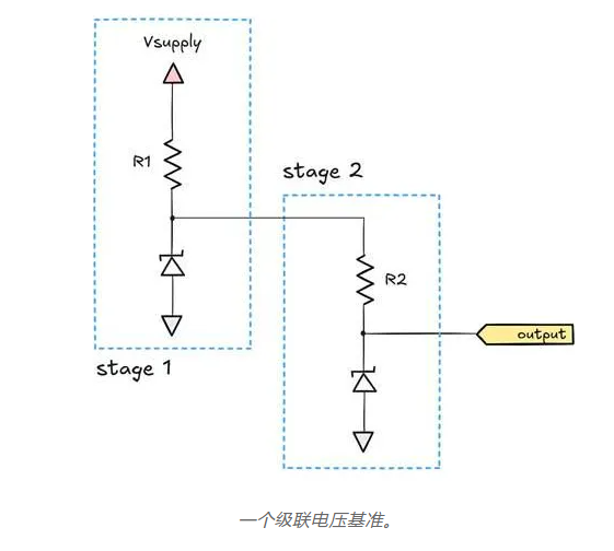 當然,第一個二極管的齊納電壓應該高于第二個。此外,為了使級聯(lián)布局正常工作,我們需要確保第二級吸收的電流遠低于流經預期電阻-二極管路徑的電流。確保這一特性的一種方法是選擇 R1? R2。另一種解決方案是用一個晶體管電路來隔離這兩個階段,該電路鏡像第一級的輸出電壓供第二級使用;這種電壓跟隨器電路在這里討論。