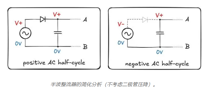 這個電路稱為半波整流器。如果我們以標記為 B 的底部輸出支路作為所有電路電壓的參考點,然后分別評估輸入交流波形的正半周期和負半周期,分析是最簡單的: