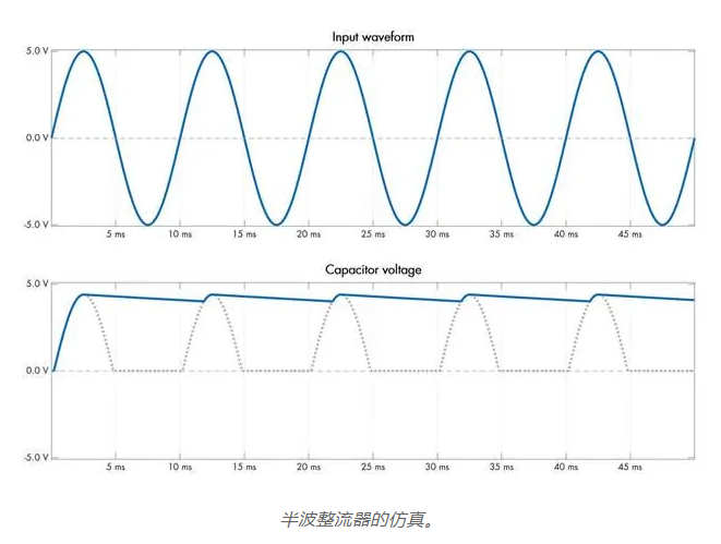在正弦波的正半周期,當電源的上部端子為正時,二極管最初是正向偏置的。假設信號源阻抗較低,這允許電容器充電到等于輸入信號峰值幅度減去某個二極管壓降的電壓。