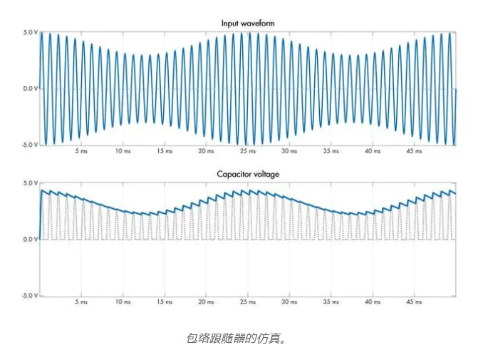 如果負載電阻成為電路的永久部分,并且其選擇使得電容器放電足夠快,以跟上傳輸波的幅度調制,我們就得到了一個稱為包絡跟隨器的電路。該電路是在 AM 廣播電路中從載波信號中提取近似調制波形的簡單方法: