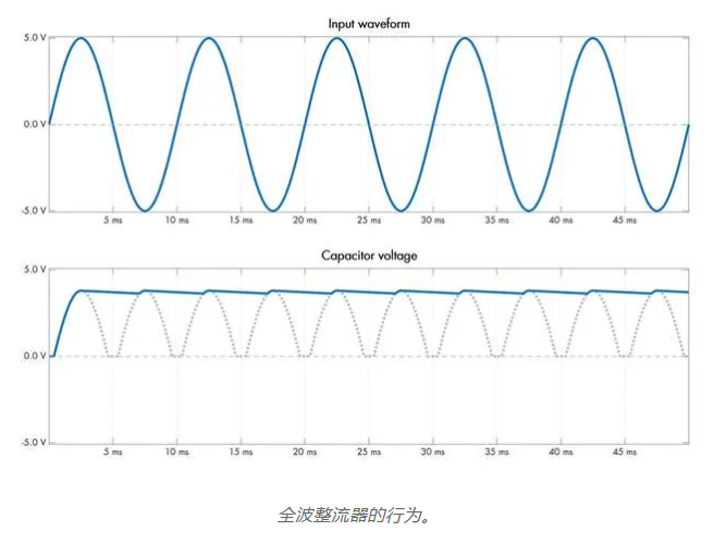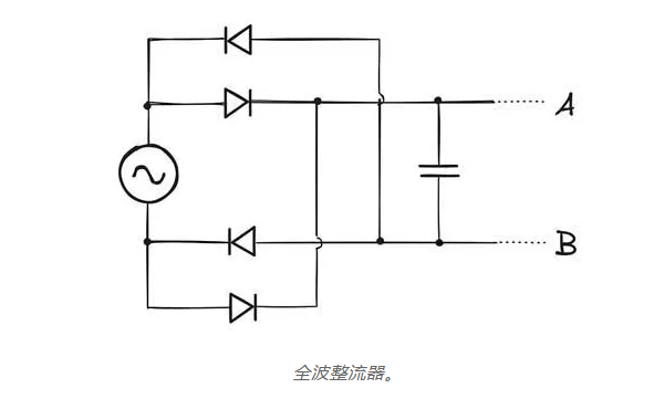 半波整流器的缺點是電容器僅由正弦波的正半周期充電;如果目標是最大化傳遞給負載的功率,這是浪費的。這個缺陷可以通過構建一個全波整流器來解決,如下所示: