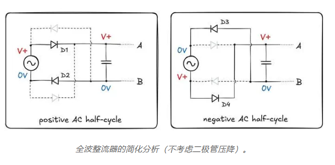 在正半周期,二極管 D1 和 D2 最初是正向偏置的;這允許電容器充電到交流峰值電壓(減去兩個二極管的壓降總和)。在負半周期,二極管 D3 和 D4 變?yōu)檎蚱?,這將輸出 B 連接到上部電源端子。同時,當前處于更高電壓的底部電源端子連接到 A 點。這允許電容器繼續(xù)以與之前相同的極性充電。
