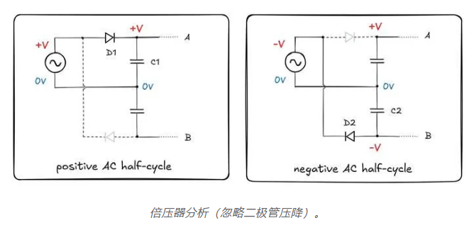 倍壓器有多種形式,但一種特別簡潔的設計如下所示。該電路輸出的直流電壓等于以零為中心的輸入波形峰值幅度的兩倍,減去通常的二極管壓降。這與前面討論的整流器電路形成對比,后者僅產生接近峰值幅度的直流電壓: