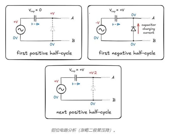 接下來,讓我們看看負半周期(右側)。在這種情況下,頂部二極管始終是反向偏置的,因此它不導電;C1 保持電荷。同時,下方的二極管 D2 可以導通,它為 C2 充電,使得輸出端子 B 相對于中點最終處于負電壓。實際上,我們將輸入波形的正峰值電壓存儲在 C1 中,將負最大值存儲在 C2 中。B 和 A 之間的總電壓是 V(peak) *2(再次強調,減去預期的二極管壓降)。