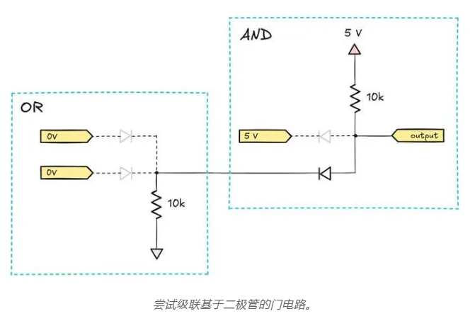 在或門電路(左)的情況下,如果正電源軌連接到任何輸入端子,這將使相應的二極管正向偏置,并導致電流流過電阻。因為正向偏置二極管的阻抗遠低于 10 kΩ 電阻的阻抗,所以輸出電壓會飆升到非常接近上電源軌。