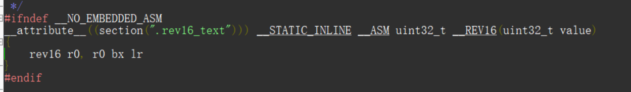 STM32的庫(kù)部分存在匯編語言,格式化后可能會(huì)導(dǎo)致編譯錯(cuò)誤。例如對(duì)cmsis_armcc.h進(jìn)行格式化時(shí) 會(huì)導(dǎo)致匯編語句錯(cuò)誤。