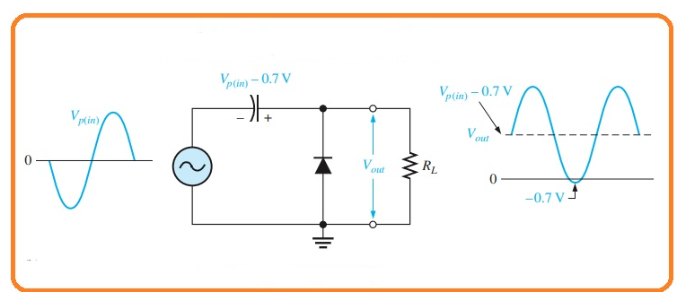 對(duì)于該電路的實(shí)際工作,假設(shè)波的負(fù)循環(huán)通過(guò)二極管。在信號(hào)二極管的負(fù)半部分處于正向偏置狀態(tài)期間,由于鉗位電路中的電容器充電至值 (Vp(in) – 0.7 V),如上圖所示。