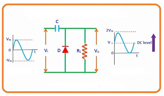 鉗位電路也稱為直流電阻,主要功能是將一些直流電平添加到輸入交流信號(hào)中。下圖中顯示了鉗位電路,它在輸入交流信號(hào)中添加了一個(gè)正直流電平。