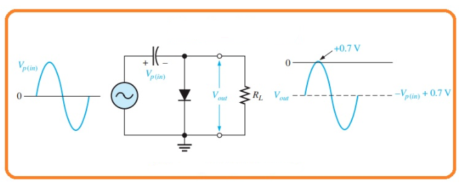 因此,負(fù)載電阻兩端的電壓將是電容器兩端的電壓 -V m和輸入源電壓-V m的相加,即 (-2V m )。由于原始信號(hào)移動(dòng)到 x 軸下方。