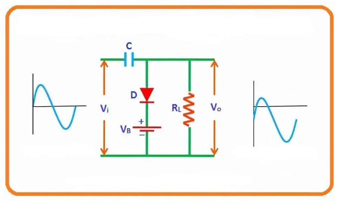 對(duì)于正輸入半周期:當(dāng)輸入源的正周期穿過(guò)二極管時(shí),當(dāng)輸入源的輸入電壓值小于直流電源時(shí),與二極管相連的直流源使其處于正向偏置狀態(tài)。