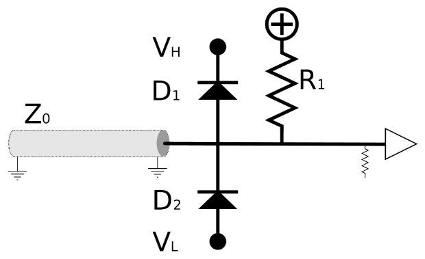 鉗位二極管不僅僅是為了改變電壓基線。它們?cè)诰徑馑矐B(tài)事件方面非常有用,尤其是ESD和雷電浪涌。例如,當(dāng)輸入電壓高于 Vh 時(shí),D1 正向偏置。因此,過(guò)多的電流流過(guò) D1 而不是負(fù)載。限流電阻器通常放置在二極管之前,以確保后者在限制范圍內(nèi)工作。