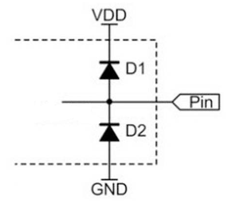 GPIO的電路配置:GPIO的參考電源VDD由鉗位二極管D1的陰極上拉,鉗位二極管D2的陽(yáng)極接GND。